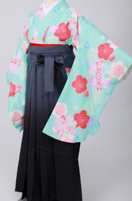 爽やかな色が素敵な二尺袖とグレーの色がスタイリッシュな袴を合わせたコーディネートです。涼しげにも見える組み合わせは上品さも演出しています。二尺袖はパステルカラーなので、暗すぎるということもなく、華やかな卒業式を演出してくれます。