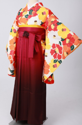 大人っぽい女性に合うワインレッドと赤のグラデーション袴に温かな印象を持たせるオレンジの二尺袖を合わせたコーディネートです。グラデーションで暗く見えやすい袴も秋タイプの方が着れば大人の雰囲気をより表現できますよ。