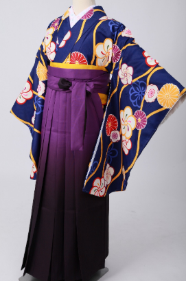 定番の紫色の袴に、紺色の二尺袖を合わせているシックでクールなコーディネートです。暗めのカラーかと思いますが、着てみるとまとまりがあって素敵なんです。グラデーションで明るめの紫になっているのもポイントです。冬タイプの方にピッタリです。